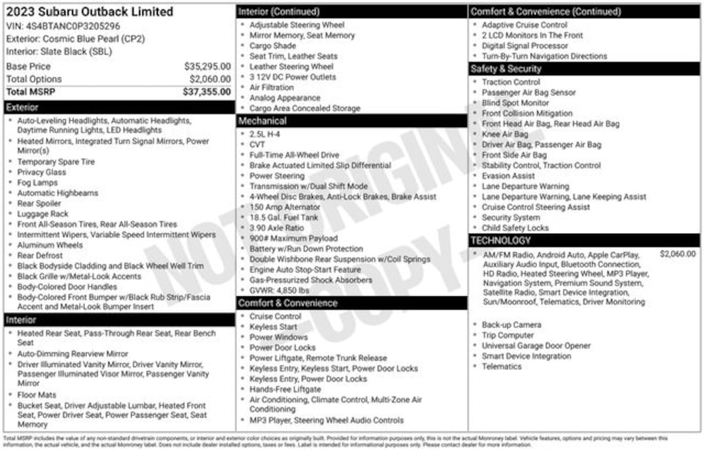 Experience the ultimate in versatility, comfort, and advanced technology with this 2023 Subaru Outback Limited. Discover the perfect balance of rugged capability and refined sophistication that will elevate your driving experience. Visit our showroom today and let us demonstrate how this exceptional Outback can become the perfect addition to your lifestyle.