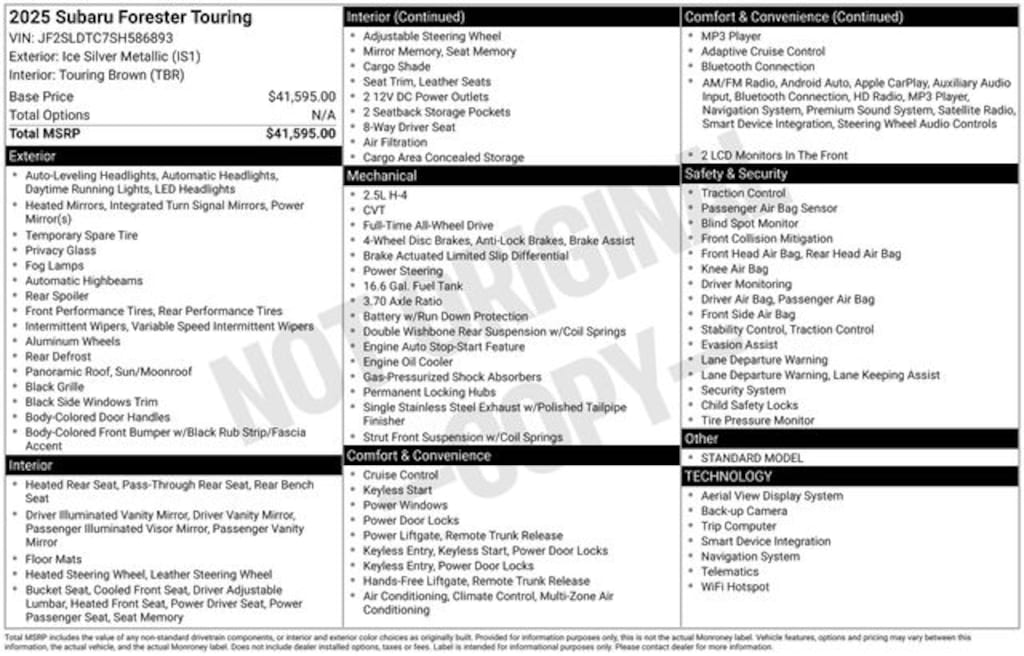 Ice Silver Metallic 2025 Subaru Forester Touring AWD Lineartronic CVT 2.5L 4-Cylinder DOHC 16V