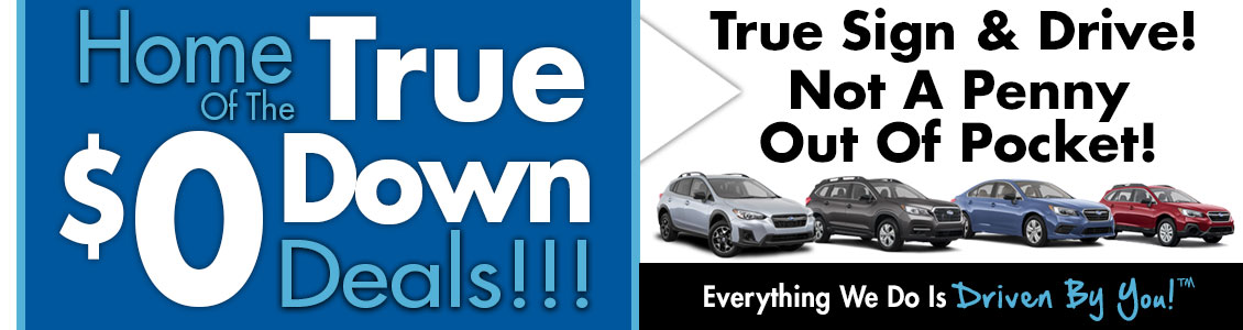 At Tri-City Subaru, you can sign and drive many of our most popular new Subaru vehicles with absolutely no down payment. Simply come in, sign and drive off with a brand new Subaru. You can search our New Subaru Inventory to choose from five of our most popular Subaru vehicles including Outback, Forester, Legacy, Ascent, Impreza and Crosstrek. It's just one more way that we ensure "Everything We Do is Driven By You!™".