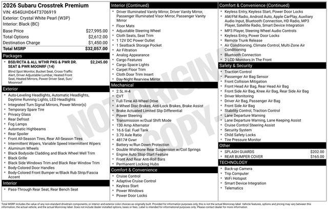 Crystal White Pearl 2026 Subaru Crosstrek Premium AWD Lineartronic CVT 2.5L 4-Cylinder DOHC 16V