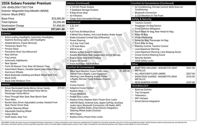 Gray Metallic 2026 Subaru Forester Premium AWD Lineartronic CVT 2.5L 4-Cylinder DOHC 16V