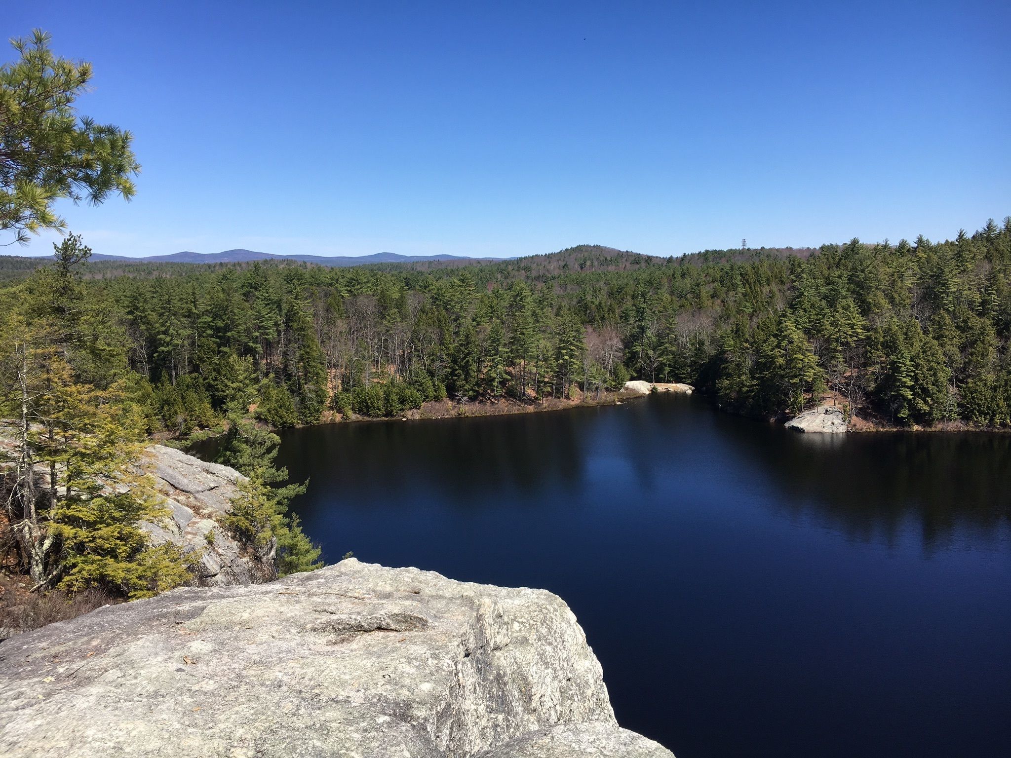 The newly cleared tail treks thru higher ground of hemlock and hardwood forest and leads to a beautiful rock ledge overlooking the pond and surrounding hills. With the trail debris now cleared recreational users can begin using the new trail and land managers can begin closing the old trail along the water's edge. Â