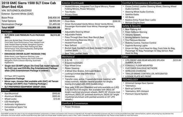 2018 GMC Sierra 1500 SLT Summit White 8-Speed Automatic with Overdrive, 4WD, Jet Black Leather, 10-Way Power Driver's Seat Adjuster, 110-Volt AC Power Outlet, 150 Amp Alternator, 1st & 2nd Row Color-Keyed Carpeted Floor Mats, 2-Speed Active Electronic AutoTrac Transfer Case, 20" x 9" Chrome Clad Aluminum Wheels, 4.2" Diagonal Color Display Driver Info Center, 6-Speaker Audio System, 6" Rectangular Chromed Tubular Assist Steps, Adjustable pedals, Auto-dimming door mirrors, Auto-Dimming Inside Rear-View Mirror, Auto-dimming Rear-View mirror, Auxiliary External Transmission Oil Cooler, Bed Liner, Bose Speaker System, CD player, Chrome Bodyside Moldings, Chrome Door Handles, Chrome Mirror Caps, Color-Keyed Carpeting, Deep-Tinted Glass, Driver & Front Passenger Illuminated Vanity Mirrors, Dual-Zone Automatic Climate Control, Electric Rear-Window Defogger, Enhanced Driver Alert Package, Exterior Parking Camera Rear, EZ Lift & Lower Tailgate, Front dual zone A/C, Front fog lights, Front Frame-Mounted Black Recovery Hooks, Front Full Feature Power Reclining Bucket Seats, Fully automatic headlights, Garage door transmitter, GMC 4G LTE, GMC Connected Access, HD Radio, Heated & Ventilated Front Bucket Seats, Heated door mirrors, Heated Driver & Front Passenger Seats, Heavy Duty Suspension, Heavy-Duty Rear Locking Differential, High-Intensity Discharge Headlights, High-Performance LED Headlamps, Integrated Trailer Brake Controller, Lane Keep Assist, Leather Appointed Seat Trim, Leather Wrapped Heated Steering Wheel, Leather Wrapped Steering Wheel w/Cruise Controls, LED Cargo Box Lighting, LED Tailamps w/Signature, Low Speed Forward Automatic Braking, Manual Tilt/Telescoping Steering Column, Memory seat, OnStar & GMC Connected Services Capable, Power Adjustable Pedals, Power door mirrors, Power driver seat, Power Folding & Adjustable Heated Outside Mirrors, Power Sliding Rear Window w/Defogger, Power Sunroof, Power Windows w/Driver Express Up & Down, Preferred Equipment Group 4SA, Premium audio system: GMC Infotainment System, Radio: AM/FM/GMC Infotainment & Navigation, Radio: AM/FM/GMC Infotainment System, Rear 60/40 Folding Bench Seat (Folds Up), Rear step bumper, Rear Wheelhouse Liners, Remote Keyless Entry, Remote Vehicle Starter System, Single Slot CD/MP3 Player, SiriusXM Satellite Radio, SLT Crew Cab Premium Plus Package, Speed control, Split folding rear seat, Spray-On Pickup Box Bed Liner w/GMC Logo, Steering Wheel Audio Controls, Steering wheel mounted audio controls, Telescoping steering wheel, Theft Deterrent System (Unauthorized Entry), Thin Profile LED Fog Lamps, Tilt steering wheel, Trailering Equipment, Turn signal indicator mirrors, Ultrasonic Front & Rear Park Assist, Universal Home Remote. CARFAX One-Owner. Priced below KBB Fair Purchase Price!