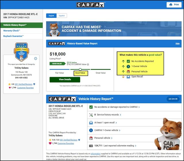 2017 Honda Ridgeline RTL-E White Diamond Pearl Black w/Leather Seat Trim, 8 Speakers, AM/FM radio: SiriusXM, Apple CarPlay/Android Auto, Auto-dimming Rear-View mirror, Bluetooth® Hands-Free Link, Emergency communication system: HondaLink, Exterior Parking Camera Rear, Front dual zone A/C, Front fog lights, Fully automatic headlights, Garage door transmitter: HomeLink, Heated door mirrors, Heated Front Bucket Seats, Heated steering wheel, Honda Satellite-Linked Navigation System, Leather Seat Trim, Memory seat, Navigation system: Honda Satellite-Linked Navigation System, Power door mirrors, Power driver seat, Power moonroof, Power passenger seat, Radio: AM/FM/MP3 w/Nav System & Trunk-Bed Audio, Rear step bumper, Remote keyless entry, SIRIUS XM Radio, Speed control, Split folding rear seat, Steering wheel mounted audio controls, Telescoping steering wheel, Tilt steering wheel, Turn signal indicator mirrors, Wheels: 18" Exclusive Machine-Finished Alloy. CARFAX One-Owner.