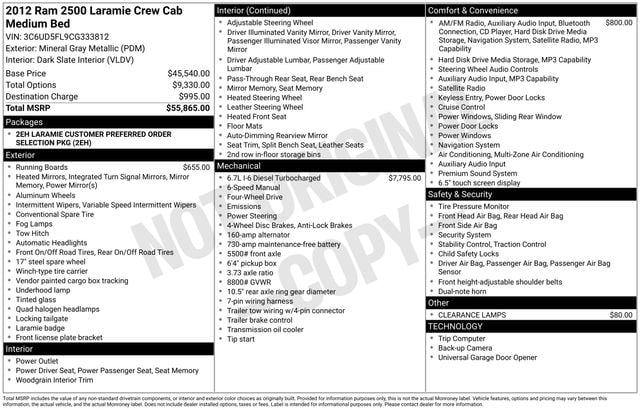In terms of power, the 2012 Ram Heavy Duty tops the charts with the available, legendary 6.7-liter Cummins High Output Turbo Diesel engine, which produces 350 horsepower (261 kW) at 3,000 rpm and a class-leading 800 lb. -ft. of torque (1083 Nâ¢m) at only 1,500 rpm.