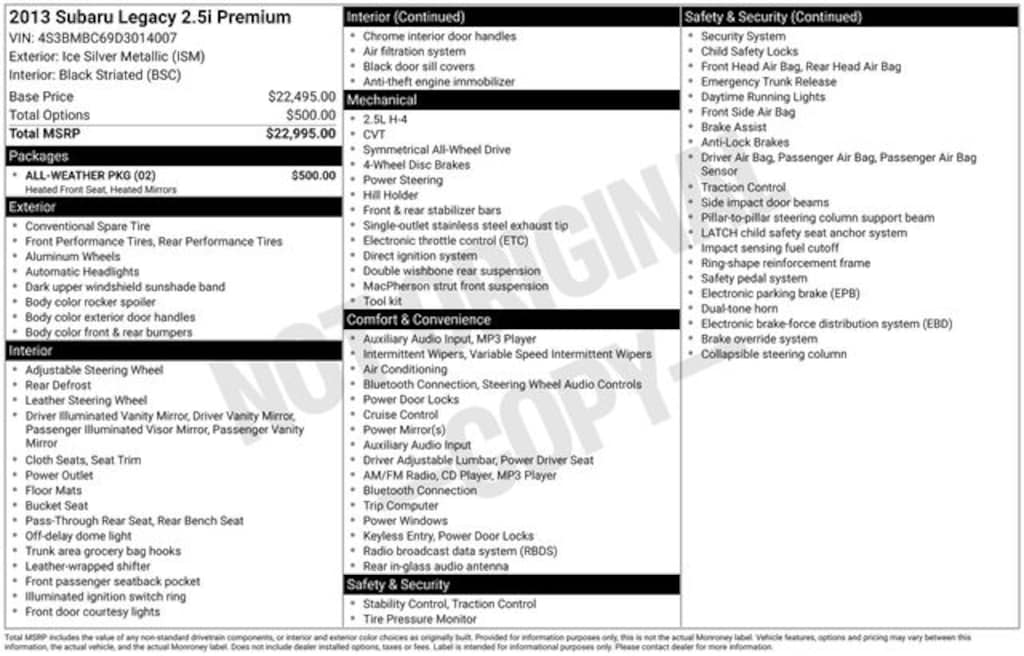 2013 Subaru Legacy 2.5i Ice Silver Metallic Air Conditioning, All-Weather Package, AM/FM Stereo w/Single-Disc CD Player, Dual Mode Heated Front Seats, Fully automatic headlights, Heated Exterior Mirrors, Power door mirrors, Power driver seat, Reclining Front Bucket Seats, Remote keyless entry, Split folding rear seat, Steering wheel mounted audio controls, Steering-Wheel Paddle-Shift Control Switches, Telescoping steering wheel, Tilt steering wheel, Wheels: 17" x 7.5" Aluminum Alloy w/Silver Finish, Windshield Wiper De-Icer. Clean CARFAX.