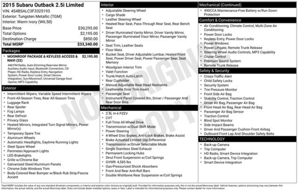 Whether you're embarking on a weekend adventure or navigating the daily grind, this 2015 Subaru Outback 2.5i Limited is ready to exceed your expectations. Experience the perfect blend of capability, technology, and style â" schedule a test drive today and discover why the Outback is the ultimate companion for your active lifestyle.