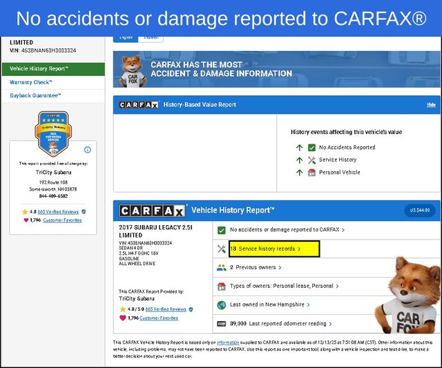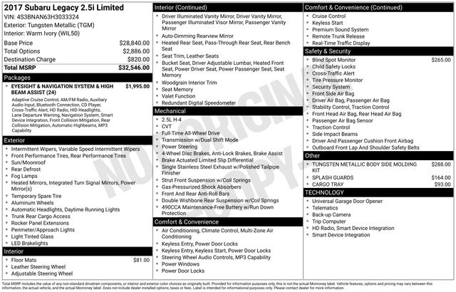 This 2017 Subaru Legacy 2.5i Limited represents an exceptional value, with its meticulously maintained condition, impressive array of premium features, and the peace of mind that comes with Subaru's renowned reliability and safety. We invite you to experience the difference for yourself. Schedule a test drive today and discover how this exceptional sedan can elevate your driving experience.
