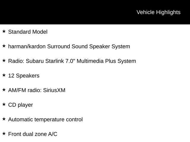 Step inside and you'll be surrounded by a wealth of premium amenities, including the Subaru STARLINK 7.0" Multimedia Plus System with a high-quality harman/kardon Surround Sound Speaker System, dual-zone automatic climate control, and a power moonroof to let the natural light in. Heated front and rear seats, a power driver's seat with memory function, and a leather-wrapped steering wheel add to the exceptional comfort and convenience.