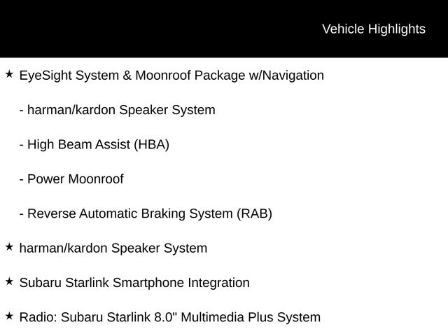 ⢠EyeSight System & Moonroof Package with Navigation, featuring a state-of-the-art navigation system, SiriusXM NavTraffic and Travel Link, a premium harman/kardon audio system, and a power moonroof
