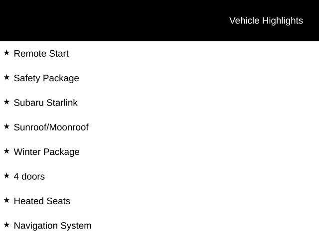 ⢠Bluetooth, Active Lane Management, Adaptive Cruise Control, Apple CarPlay/Android Auto, Backup Camera, Blind Spot Monitoring And Rear Cross Path Detection, Climate Package, Cold Weather Package, EyeSight Driver Assist Technology, Full-Speed Collision Warning With Active Braking, Leather Seats, Limited Package, Moonroof, Navigation System, Premium Audio Package, Remote Start, Safety Package, Subaru Starlink, Sunroof/Moonroof, Winter Package, and Heated Seats
