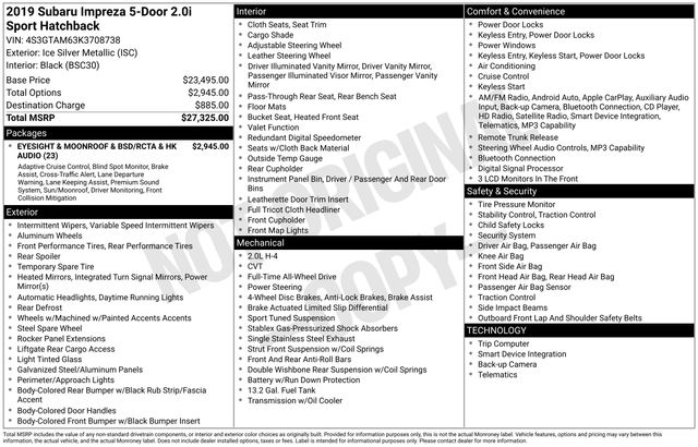2019 Subaru Impreza 2.0i Sport Ice Silver Metallic 18" Alloy Wheels, 6 Speakers, Blind Spot Detection (BSD), Emergency communication system, Exterior Parking Camera Rear, EyeSight & Moonroof & BSD/RCTA & HK Audio, EyeSight System, Fully automatic headlights, harman/kardon Amplifier & Speakers, Heated door mirrors, Heated Front Bucket Seats, Power door mirrors, Power Moonroof, Radio: Subaru STARLINK 8.0" Multimedia Plus System, Rear Cross Traffic Alert (RCTA), Remote keyless entry, Speed control, Split folding rear seat, Sport Fabric Upholstery, STARLINK/Apple CarPlay/Android Auto, Steering wheel mounted audio controls, Telescoping steering wheel, Tilt steering wheel, Turn signal indicator mirrors. CARFAX One-Owner. Clean CARFAX. Odometer is 67182 miles below market average!