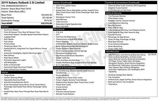 2019 Subaru Outback 2.5i Ay4 12 Speakers, 18" Alloy Wheels, Auto-Dimming Rear View Compass Mirror w/HomeLink, Emergency communication system, Exterior Parking Camera Rear, Front dual zone A/C, Front fog lights, Garage door transmitter, harman/kardon Surround Sound Speaker System, Heated door mirrors, Heated front seats, Heated rear seats, High Beam Assist (HBA), LED Steering Responsive Headlights, Memory seat, Moonroof & Navigation & HBA & RAB & LED SRH, Perforated Leather-Trimmed Upholstery, Power door mirrors, Power driver seat, Power Liftgate, Power Moonroof Package, Power passenger seat, Radio: Subaru STARLINK 8.0" Multimedia Nav System, Radio: Subaru STARLINK 8.0" Multimedia Plus System, Remote keyless entry, Reverse Automatic Braking (RAB), Smartphone Integration, Speed control, Split folding rear seat, Steering wheel mounted audio controls, Steering Wheel Paddle Shift Control Switches, Telescoping steering wheel, Tilt steering wheel, Turn signal indicator mirrors, Vehicle Information Display. CARFAX One-Owner. Odometer is 12730 miles below market average!
