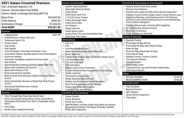 2021 Subaru Crosstrek Premium Horizon Blue Pearl Bluetooth, Active Lane Management, Adaptive Cruise Control, Apple CarPlay/Android Auto, Backup Camera, Climate Package, Cold Weather Package, EyeSight Driver Assist Technology, Full-Speed Collision Warning With Active Braking, Premium Package, Subaru Starlink, Winter Package, 4 doors, Heated Seats, 17" Alloy Wheels, 4-Wheel Disc Brakes, 6 Speakers, ABS brakes, Active Cruise Control, AM/FM radio: SiriusXM, Automatic temperature control, Brake assist, CD player, Cloth Upholstery, Electronic Stability Control, Emergency communication system: STARLINK Safety and Security (Subscription Required), EyeSight System, Four wheel independent suspension, Front fog lights, Fully automatic headlights, Heated door mirrors, Heated Front Bucket Seats, High Grade Combination Meter w/Color LCD Display, Illuminated Storage Tray in Front Center Console, Leather-Wrapped Shift Lever Handle, Low tire pressure warning, Outside temperature display, Overhead airbag, Overhead Console Shower Light, Panic alarm, Power door mirrors, Power windows, Radio: Subaru STARLINK 6.5" Multimedia Plus System, Rear Seat Reminder, Rear window defroster, Rear window wiper, Remote keyless entry, Security system, Split folding rear seat, Spoiler, Standard Model (CVT), STARLINK/Apple CarPlay/Android Auto, Steering wheel mounted audio controls, Subaru STARLINK Smartphone Integration, Telescoping steering wheel, Tilt steering wheel, Tire Pressure Monitoring System, Traction control, Variably intermittent wipers. CARFAX One-Owner. Clean CARFAX.