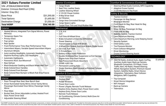 2021 Subaru Forester Limited Crimson Red Pearl 6 Speakers, Audio Sys & Driver Assist Tech & Htd Steer Wheel, Emergency communication system: STARLINK Safety and Security (Subscription Required), Exterior Parking Camera Rear, Front dual zone A/C, Front fog lights, harman kardon 576W Amp & Speaker System, Heated door mirrors, Heated Front Bucket Seats, Heated Steering Wheel, Navigation System, Paddle-Shift Control Switches, Perforated Leather-Trimmed Upholstery, Power driver seat, Power Liftgate, Power moonroof: Panoramic, Radio: Subaru Starlink 8.0" Multimedia Nav System, Radio: Subaru Starlink 8.0" Multimedia Plus System, Remote keyless entry, Reverse Automatic Braking System (RAB), Speed control, STARLINK/Apple CarPlay/Android Auto, Steering wheel mounted audio controls, Telescoping steering wheel, Tilt steering wheel, Turn signal indicator mirrors, Wheels: 18" x 7.0J Black Machine Finish Alum Alloy. CARFAX One-Owner. Clean CARFAX. Odometer is 6032 miles below market average!
