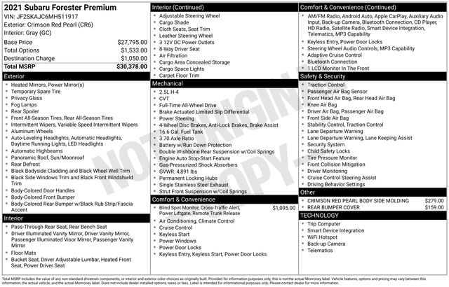 2021 Subaru Forester Premium Crimson Red Pearl 6 Speakers, Blind Spot Detection (BSD), Blind Spot Detection w/RCTA & Power Rear Gate, CD player, Cloth Upholstery, Driver's Seatback Divided Pocket, Emergency communication system: STARLINK Safety and Security (Subscription Required), Exterior Parking Camera Rear, Front fog lights, Heated door mirrors, Heated Front Bucket Seats, Multi-Function High Grade Display, Power door mirrors, Power moonroof: Panoramic, Power Rear Gate w/Automatic Close & Height Memory, Radio: Subaru Starlink 6.5" Multimedia Plus System, Remote keyless entry, Speed control, Split folding rear seat, STARLINK/Apple CarPlay/Android Auto, Steering wheel mounted audio controls, Telescoping steering wheel, Tilt steering wheel, Wheels: 17" x 7.0J Black Machine Finish Alloy. CARFAX One-Owner. Clean CARFAX.