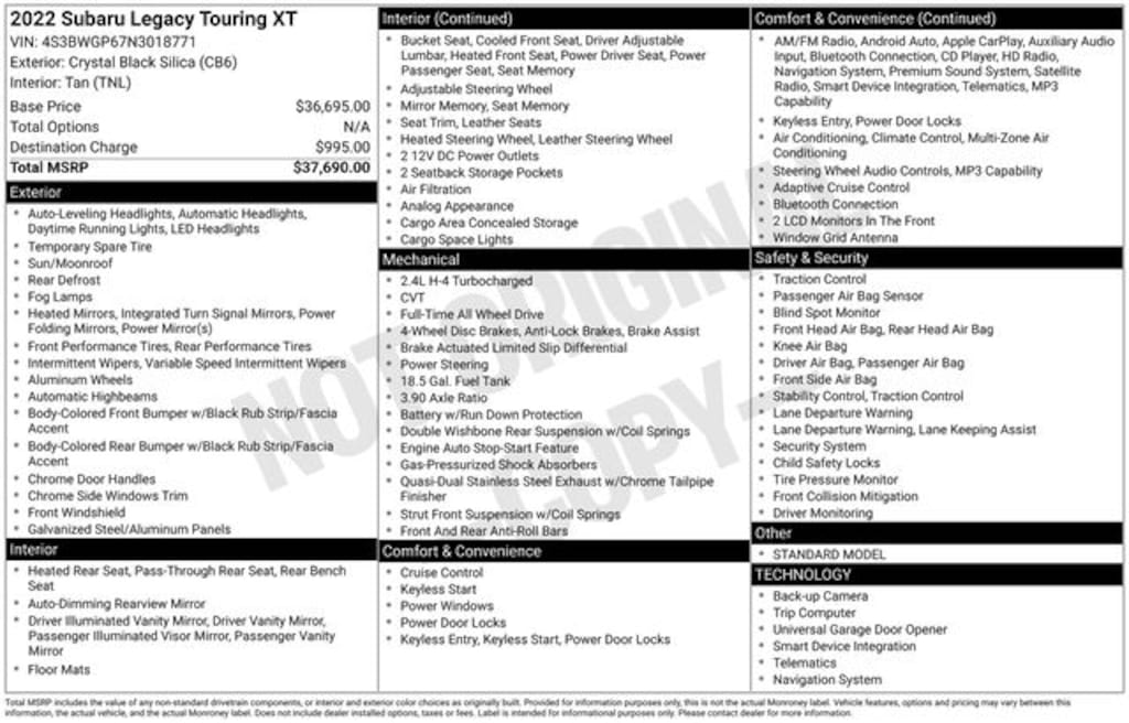 With its striking exterior design, refined interior, and impressive performance capabilities, the 2022 Subaru Legacy Touring XT is a true standout in the midsize sedan segment. Experience the difference for yourself and schedule a test drive today. We're confident you'll be impressed by the unparalleled combination of style, technology, and capability this vehicle has to offer.