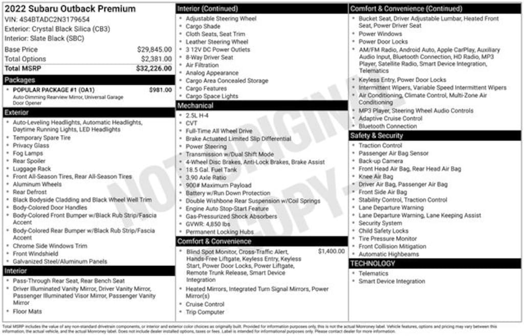 2022 Subaru Outback Premium Crystal Black Silica 6 Speakers, All-Weather Floor Liners, Auto-Dimming Exterior Mirror w/Approach Light, Auto-Dimming Mirror w/Compass & HomeLink, Blind Spot Detection (BSD), BSD w/RCTA & Keyless Access & Push Button Start, Dome Light LED Upgrade, Emergency communication system: STARLINK Safety and Security (Subscription Required), Exterior Parking Camera Rear, Front dual zone A/C, Front fog lights, Fully automatic headlights, Hands-Free Power Rear Gate, Heated door mirrors, Heated Front Bucket Seats, Keyless Access w/Push Button Start, Popular Package #1, Power door mirrors, Power driver seat, Radio: Subaru STARLINK 11.6" Multimedia Plus Sys, Rear Bumper Cover, Rear Cross Traffic Alert (RCTA), Remote keyless entry, Speed control, Split folding rear seat, Steering wheel mounted audio controls, Steering Wheel Paddle Shift Control Switches, Telescoping steering wheel, Tilt steering wheel, Turn signal indicator mirrors, Wheels: 17" x 7J Black Aluminum Alloy. Odometer is 28541 miles below market average!