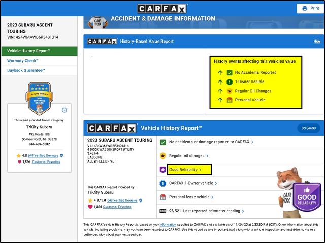 The Ascent Touring's 2.4L 4-Cylinder DOHC 16V engine, paired with the Lineartronic CVT and Subaru's renowned Symmetrical All-Wheel Drive system, delivers a confident and responsive driving experience. With an EPA-estimated 19 city/25 highway MPG, this SUV combines power and efficiency to meet your everyday needs.