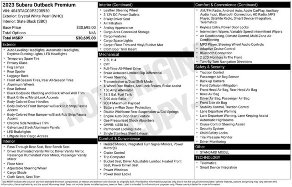 Whether you're embarking on a weekend getaway, tackling off-road adventures, or simply commuting to work, the 2023 Subaru Outback Premium is the perfect companion. Experience the perfect blend of capability, comfort, and technology â" visit our showroom today and let us help you discover the true potential of this remarkable vehicle.