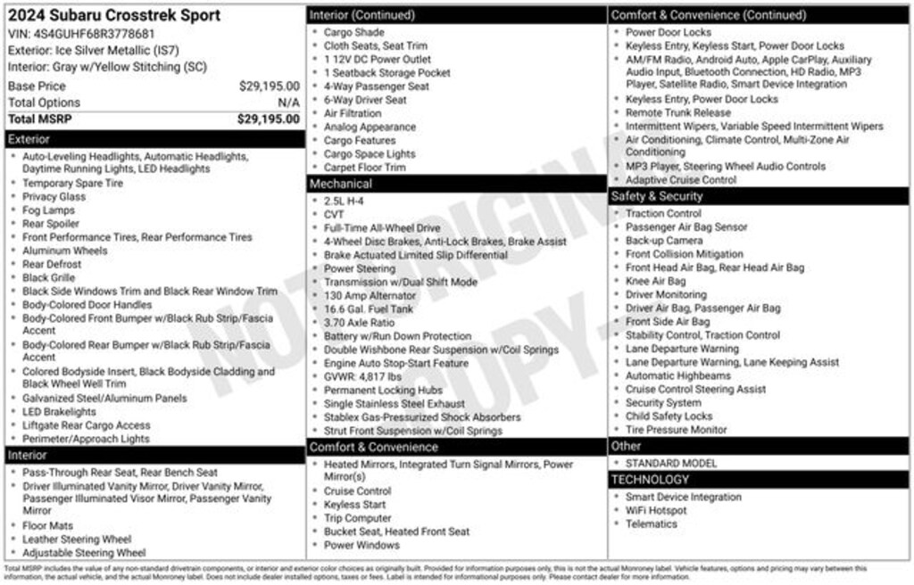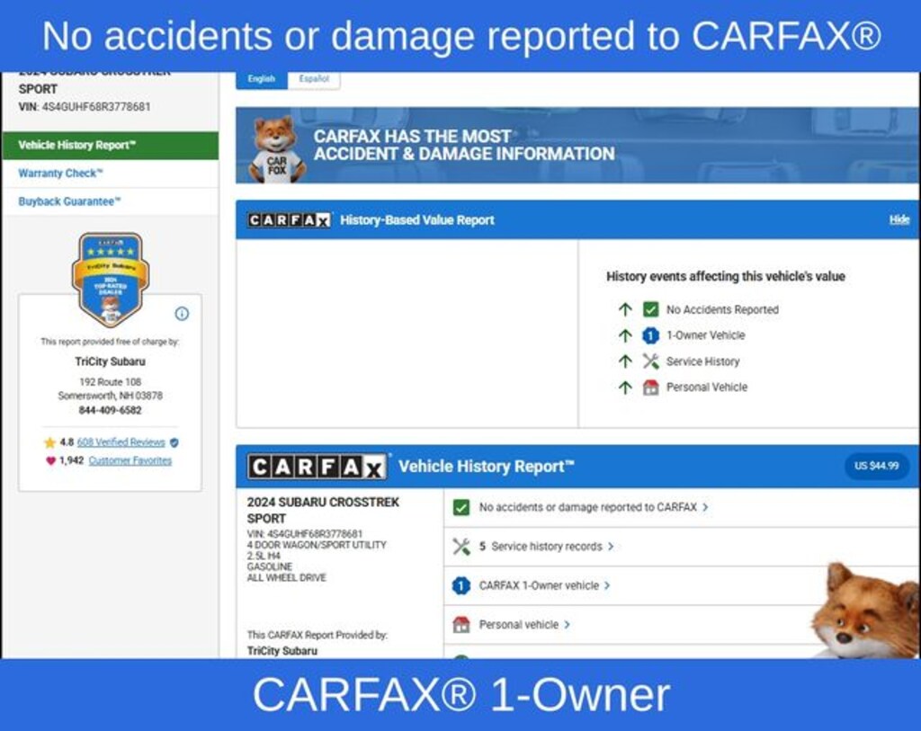 Beneath the sleek exterior, the Crosstrek Sport's 2.5L 4-Cylinder DOHC 16V engine and Lineartronic CVT with AWD deliver a thrilling driving experience. With an impressive EPA-estimated 26 MPG in the city and 33 MPG on the highway, this crossover strikes the perfect balance between power and efficiency.