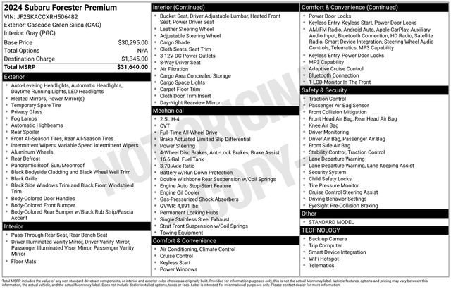 Experience the perfect blend of performance, technology, and style with this exceptional 2024 Subaru Forester Premium. Visit our showroom today and let us demonstrate how this remarkable SUV can enhance your driving experience.