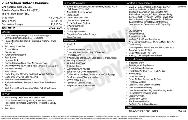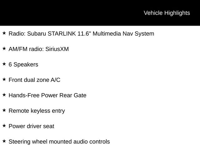 2024 Subaru Outback Premium Crystal Black Silica 6 Speakers, AM/FM radio: SiriusXM, Blind Spot Detection (BSD), BSD & RCTA & Keyless Access & Push Button Start, Cloth Upholstery, Emergency communication system: STARLINK Safety Plus (3-year free trial), Exterior Parking Camera Rear, Front dual zone A/C, Front fog lights, Hands-Free Power Rear Gate, Heated door mirrors, Heated Front Bucket Seats, Keyless Access w/Push Button Start, Power door mirrors, Power driver seat, Power Moonroof, Radio: Subaru STARLINK 11.6" Multimedia Nav System, Rear Cross Traffic Alert (RCTA), Remote keyless entry, Speed control, Split folding rear seat, Steering wheel mounted audio controls, Telescoping steering wheel, Tilt steering wheel, Turn signal indicator mirrors, Wheels: 17" x 7J Black Aluminum-Alloy. CARFAX One-Owner. Clean CARFAX. Odometer is 1082 miles below market average!