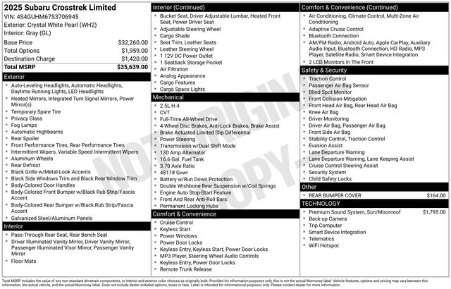 This 2025 Subaru Crosstrek Limited, with its stunning White exterior and well-equipped interior, is a true testament to Subaru's commitment to crafting vehicles that seamlessly blend capability, technology, and style. Experience the difference for yourself and schedule a test drive today. We're confident you'll be impressed by the Crosstrek Limited's exceptional versatility and refined driving dynamics.