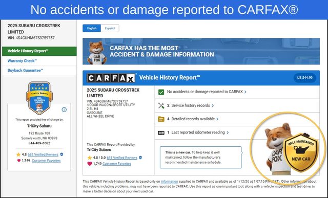 2025 Subaru Crosstrek Limited Sapphire Blue Pearl 6 Speakers, Emergency communication system, Exterior Parking Camera Rear, Front dual zone A/C, Front fog lights, Fully automatic headlights, harman/kardon Audio & Power Moonroof, harman/kardon Surround Sound Speaker System, Heated door mirrors, Heated front seats, Leather-Trimmed Upholstery, Power door mirrors, Power driver seat, Power Moonroof, Radio: Subaru 11.6" Multimedia Plus System, Remote keyless entry, Speed control, Split folding rear seat, Steering wheel mounted audio controls, Telescoping steering wheel, Tilt steering wheel, Turn signal indicator mirrors, Wheels: 18" x 7.0" J Machine Finish Aluminum-Alloy. Clean CARFAX.