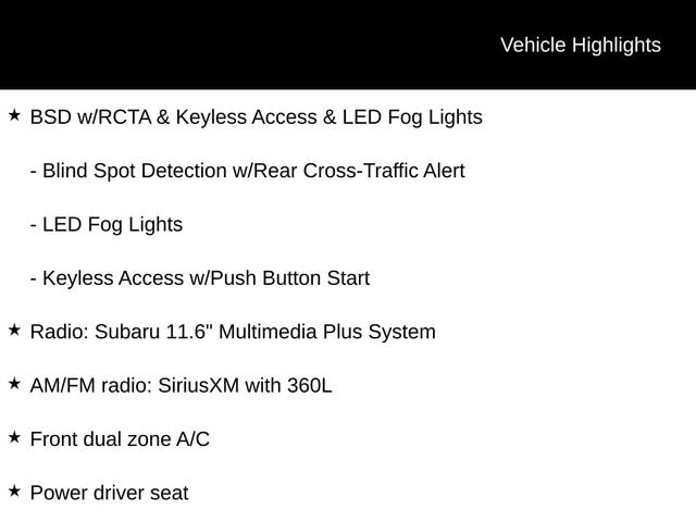 Inside, the spacious and well-appointed cabin offers premium cloth upholstery, heated front bucket seats, and a split-folding rear seat, providing ample comfort and versatility. The Subaru 11.6" Multimedia Plus System, with its intuitive interface and seamless integration of Apple CarPlay and Android Auto, keeps you connected and entertained.