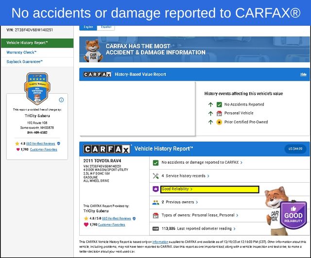 2011 Toyota RAV4 Classic Silver Metallic 4WD, Ash Cloth, 4-Wheel Disc Brakes, ABS brakes, AM/FM CD Player, Front Bucket Seats, Front Center Armrest w/Storage, Low tire pressure warning, Outside temperature display, Power door mirrors, Remote keyless entry, Speed control, Speed-sensing steering, Split folding rear seat, Telescoping steering wheel, Tilt steering wheel, Traction control. Clean CARFAX.