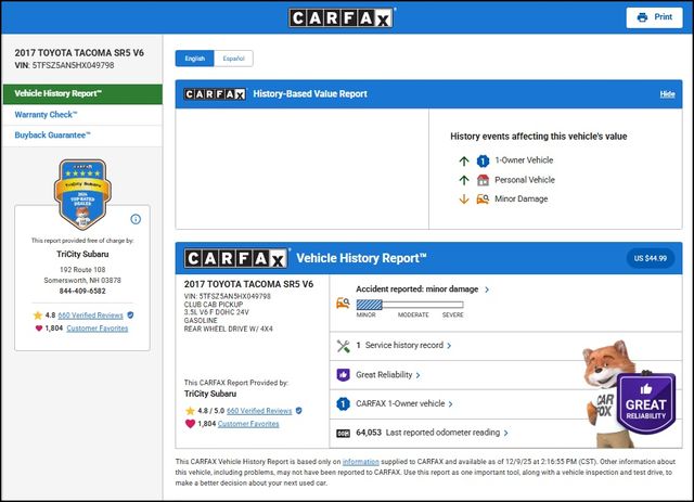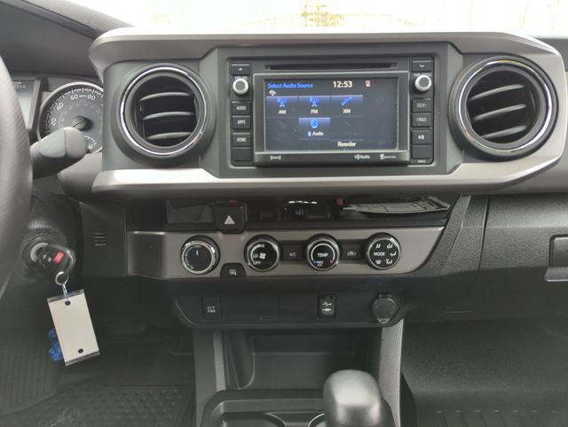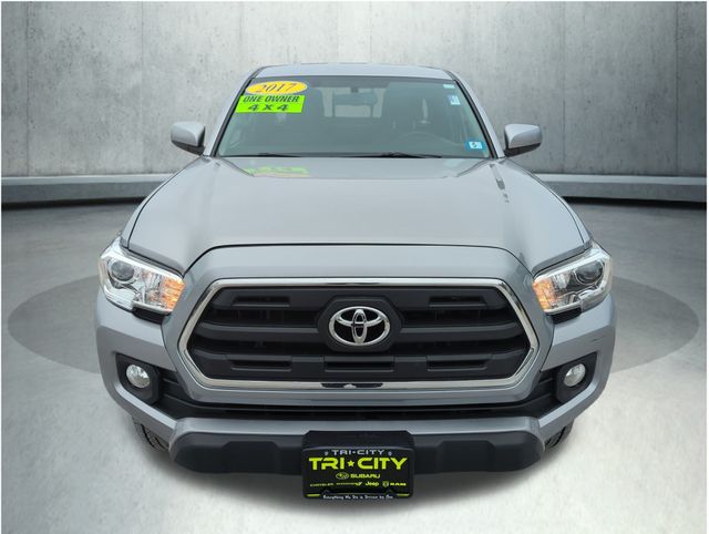 2017 Toyota Tacoma Silver 4WD, 16" Silver Alloy Wheels, 6 Speakers, Auto-dimming Rear-View mirror, Exterior Parking Camera Rear, Fabric Seat Trim (FC), Front fog lights, Radio: Entune Plus AM/FM/CD w/Connected Navigation, Rear step bumper, Remote keyless entry, Speed control, Steering wheel mounted audio controls, Telescoping steering wheel, Tilt steering wheel. CARFAX One-Owner. Odometer is 14978 miles below market average!