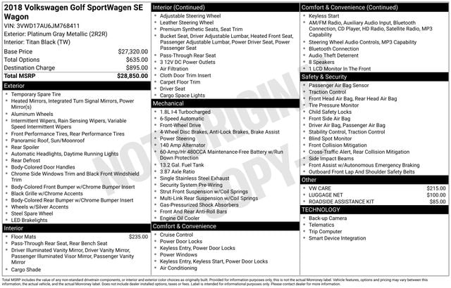 2018 Volkswagen Golf SportWagen SE Platinum Gray Metallic 8 Speakers, ABS brakes, Alloy wheels, Compass, Electronic Stability Control, Exterior Parking Camera Rear, Fully automatic headlights, Heated door mirrors, Illuminated entry, Low tire pressure warning, Power driver seat, Power moonroof, Power passenger seat, Radio: Composition Media w/8" Touchscreen, Remote keyless entry, Speed control, Split folding rear seat, Steering wheel mounted audio controls, Traction control, Turn signal indicator mirrors. Odometer is 6303 miles below market average! Priced below KBB Fair Purchase Price!